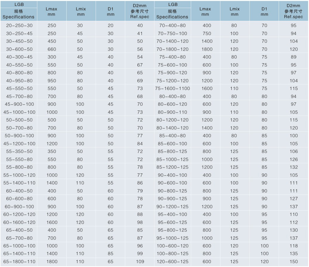 D1-保護套小端內(nèi)徑=dmaz+10毫米 D2-保護套大端內(nèi)徑 D3-大端法蘭內(nèi)徑=D2+6~8毫米 D4-小端法蘭外徑=D1-1~2毫米 dmax-被保護零件的較大直徑 Lmin-較小壓縮長度 Lmax-較大延伸長度 L-較大允許行程