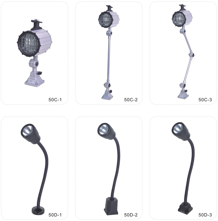 JS.109003 50C、50D系列工作燈 50C工作燈采用新光源鹵鎢燈泡,光線(xiàn)柔和,聚光性好,適用于各種大中型機(jī)床,數(shù)控機(jī)床,加工中心及普通機(jī)床的照明,并具有防水、防爆、防侵蝕等優(yōu)點(diǎn)。 50D適用于中小型機(jī)床,醫(yī)療設(shè)備及汽車(chē)修理、船舶檢修、設(shè)備維修的工作照明?蓛(nèi)裝電子變壓器,輸入不同電壓。